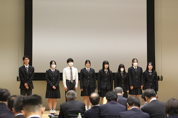 続いて、今回発表いただいた生徒の皆さんへの表彰と、生徒作文・研究文入選 商業の部 飯田OIDE長姫高校 北澤 真緒さんの表彰が行われました。