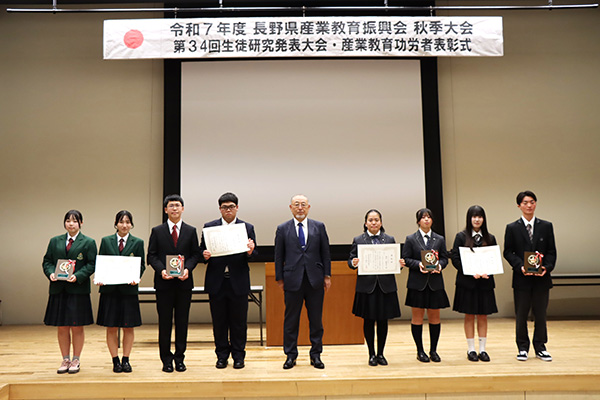 生徒研究発表では、農業部門(上伊那農業高校)、工業部門(飯田OIDE長姫高校)、商業部門(松商学園高校)、家庭部門(上田千曲高校)の代表生徒の皆さんにより、研究の成果が披露されました。