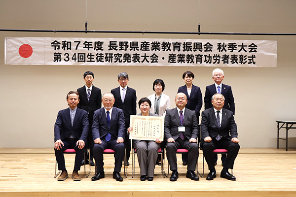 続いて、今回発表いただいた生徒の皆さんへの表彰と、生徒作文・研究文入選 商業の部 長野商業高校 増田汐里さんの表彰が行われました。